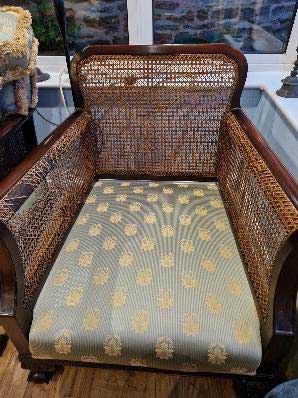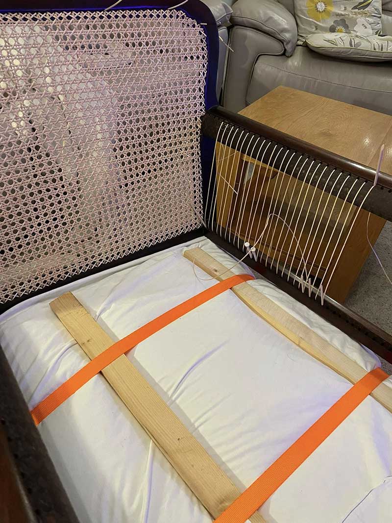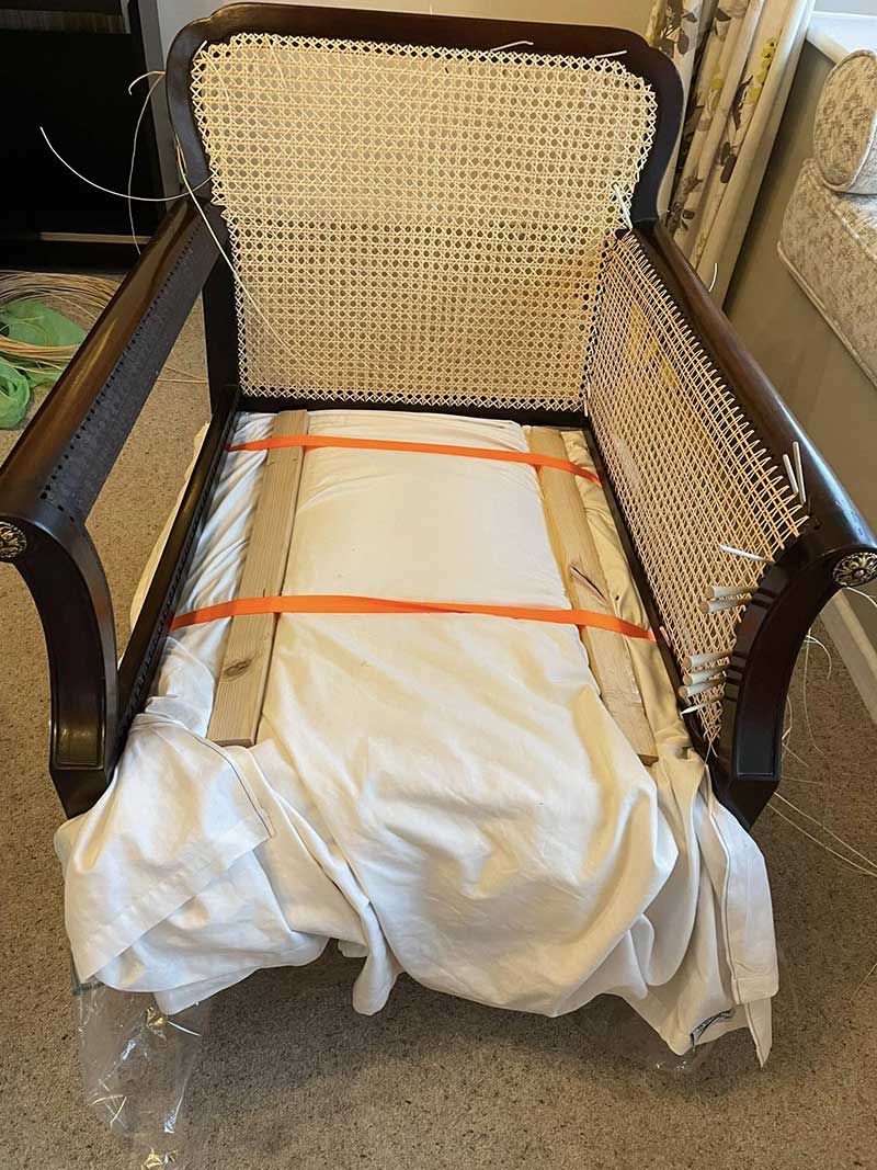 This lovely Chair, collected today, very heavy and recently been upholstered, making it difficult to see and feed the cane in and out on the underside of the arms and back. I used ratchet tension straps to hold the seat down whilst working.
